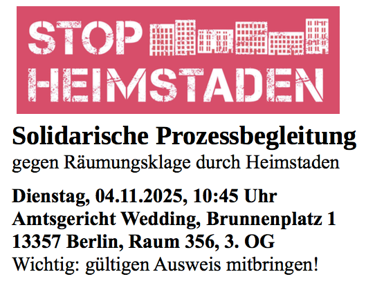 Kommt und unterstützt eine Mieterin aus Reinickendorf, die sich gegen eine Räumungsklage von Heimstaden wehrt.